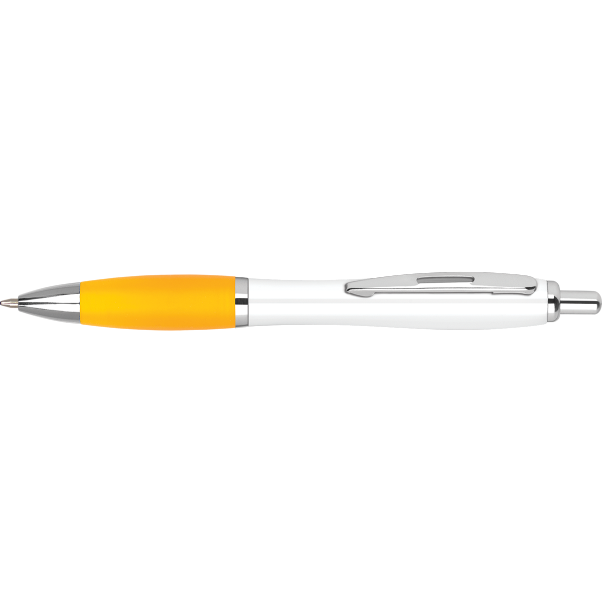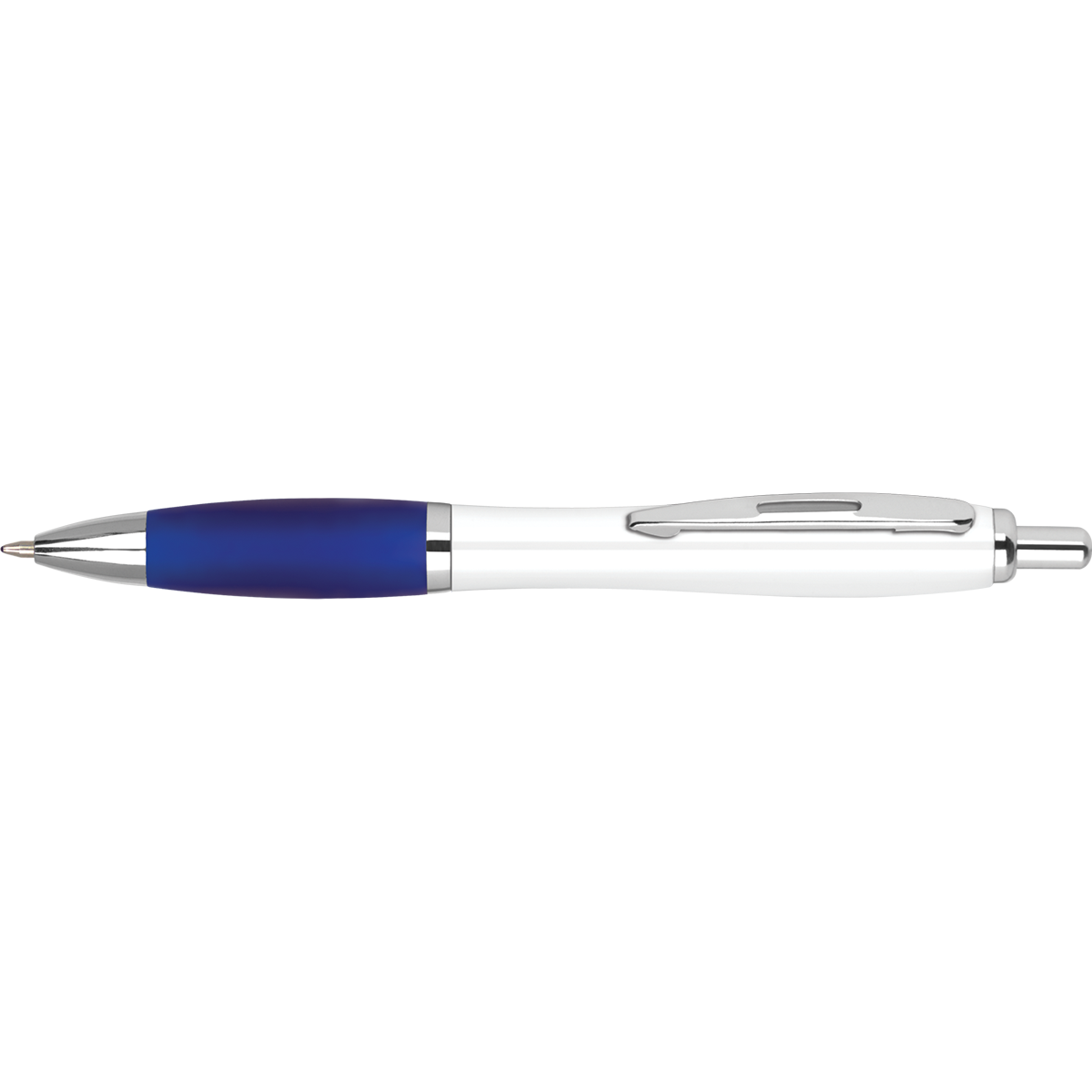 Attractive retractable ballpen with white body, chrome fittings and a comfortable coloured rubber grip. Colour range includes 10 popular colours.